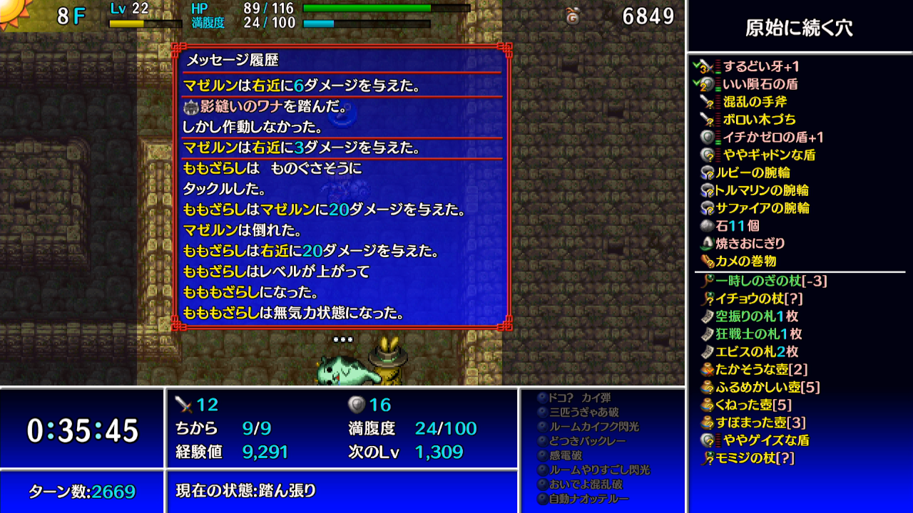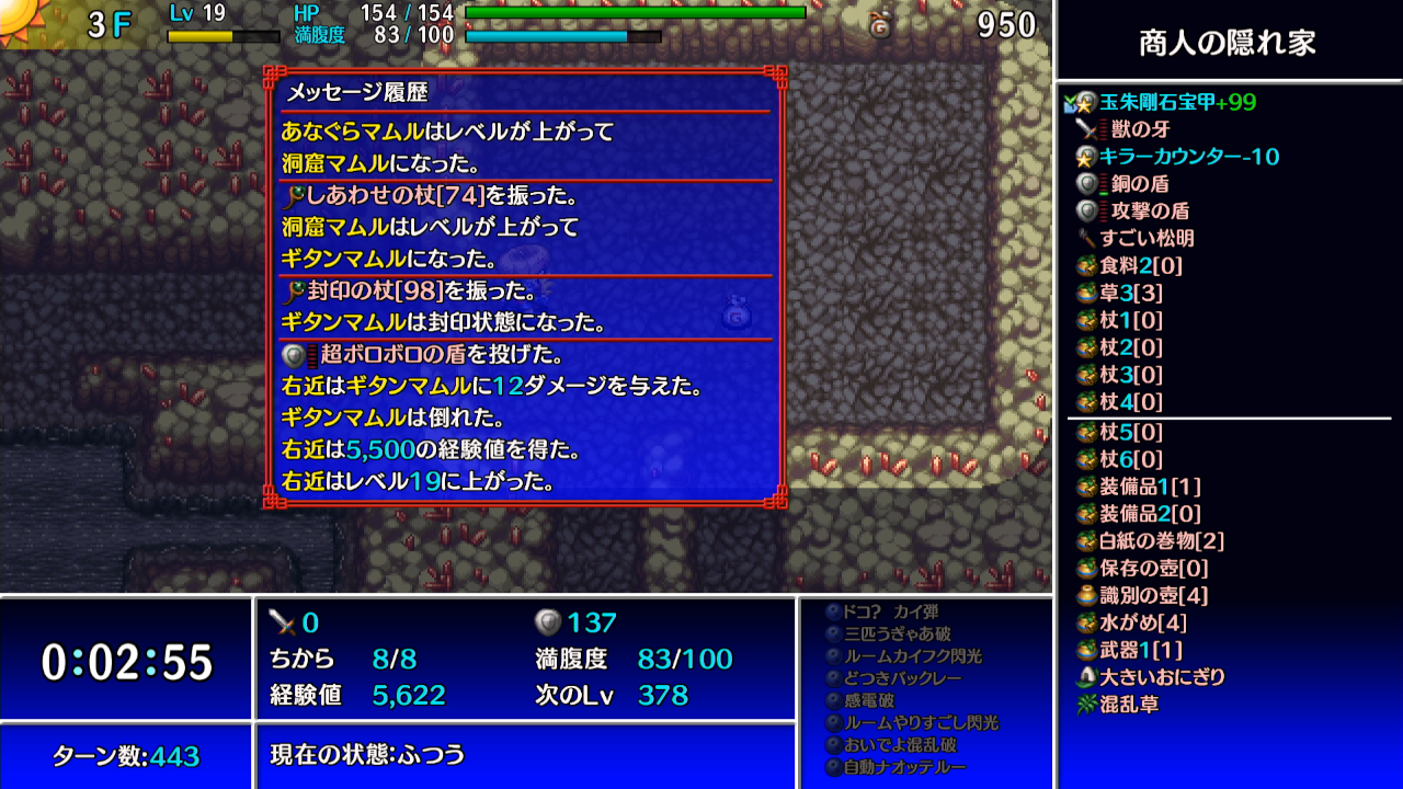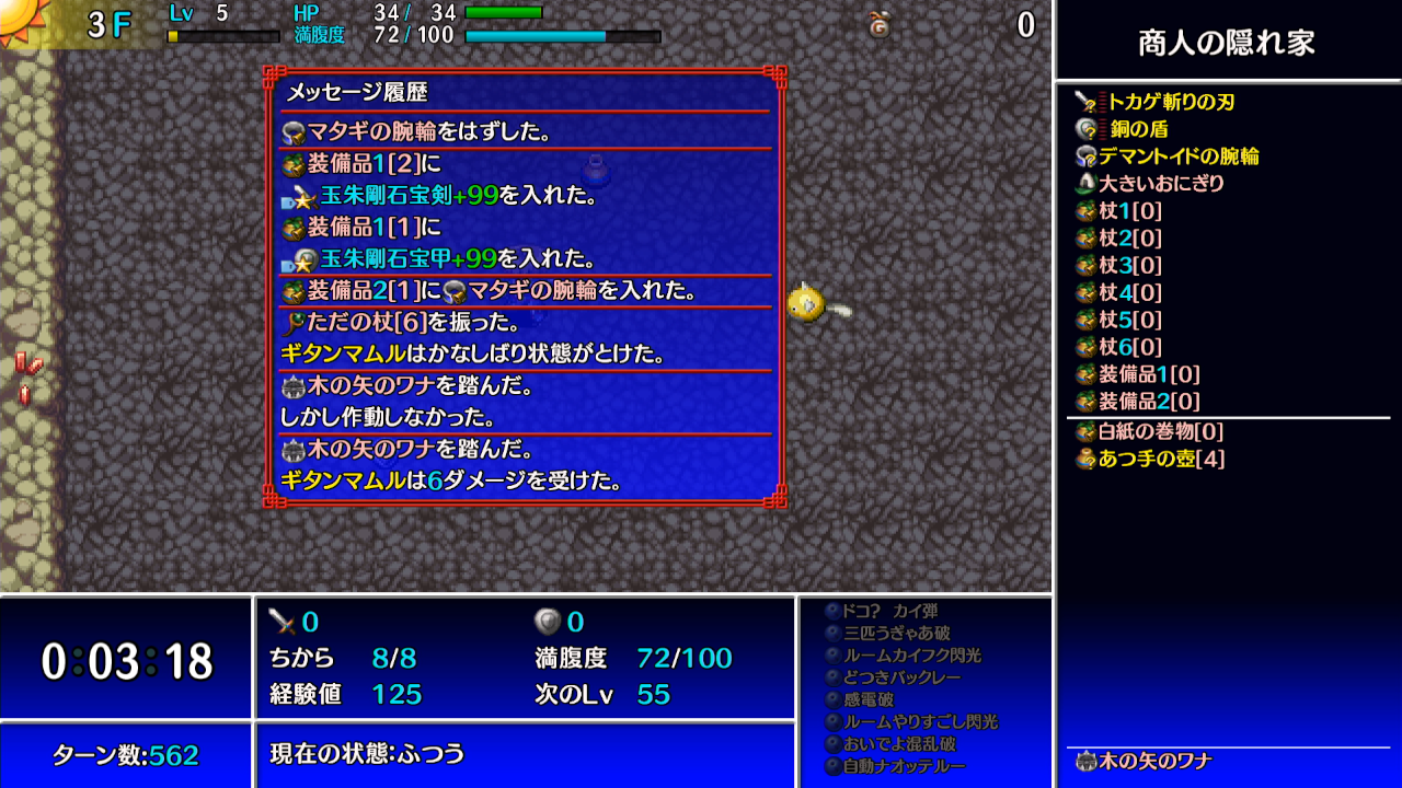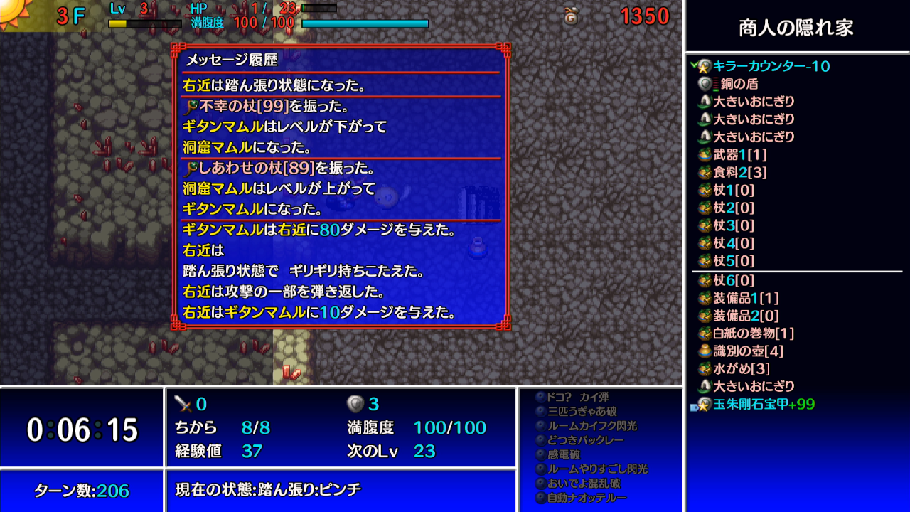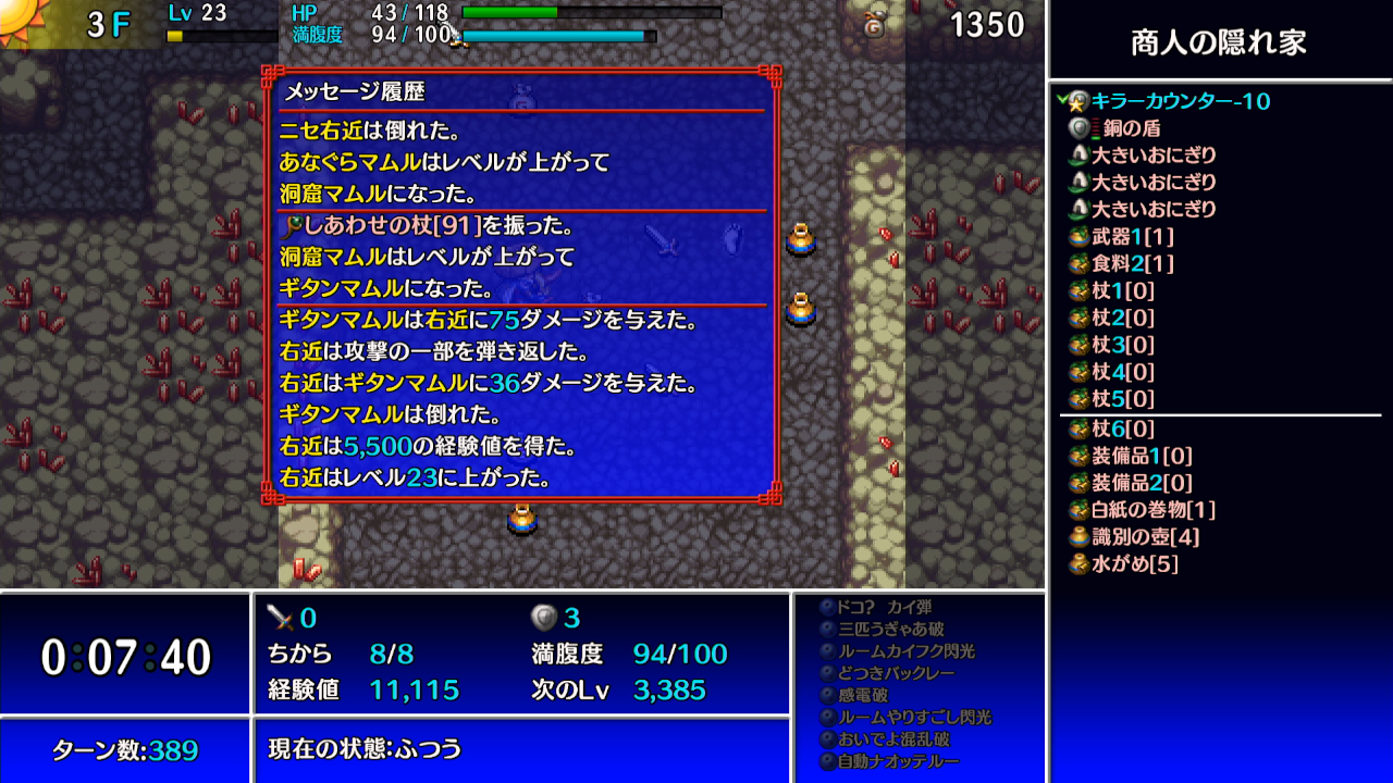 →ギタンマムルに痛み分けの杖を振って、他の敵等からシレンがダメージを受けて倒す。