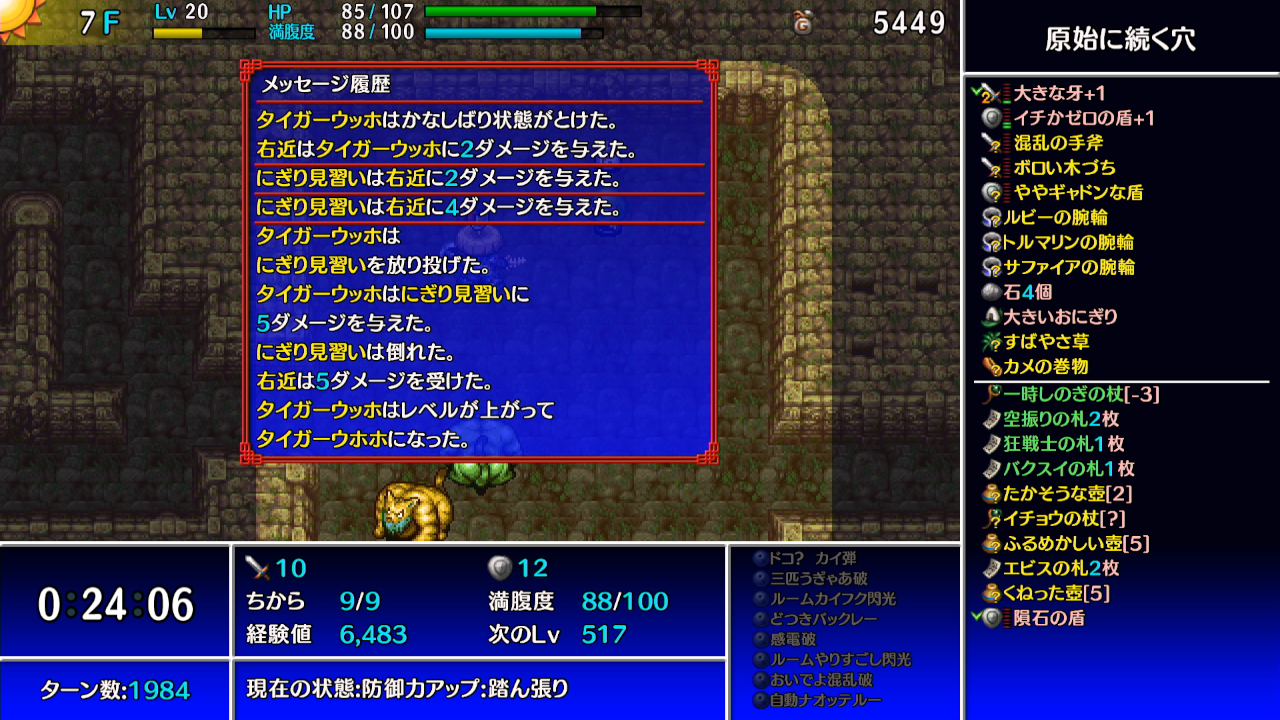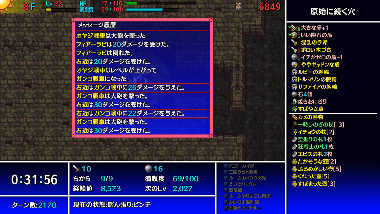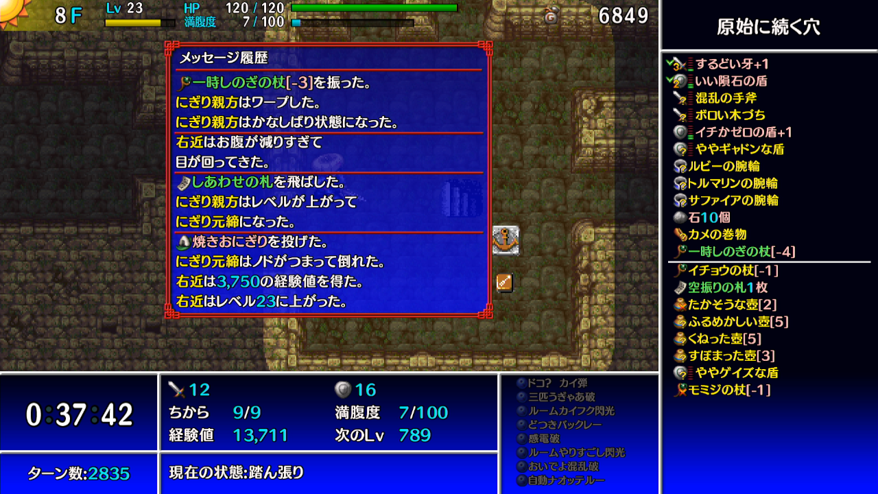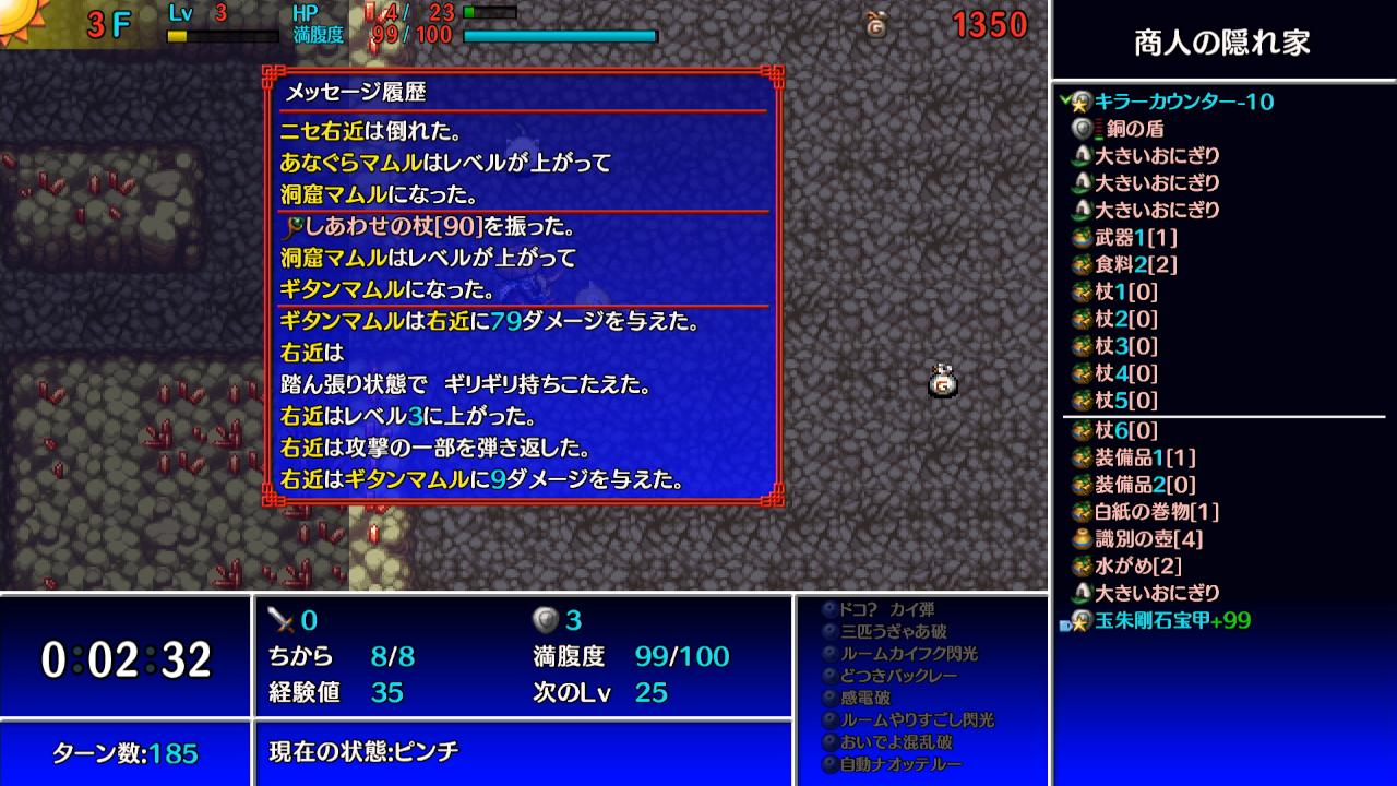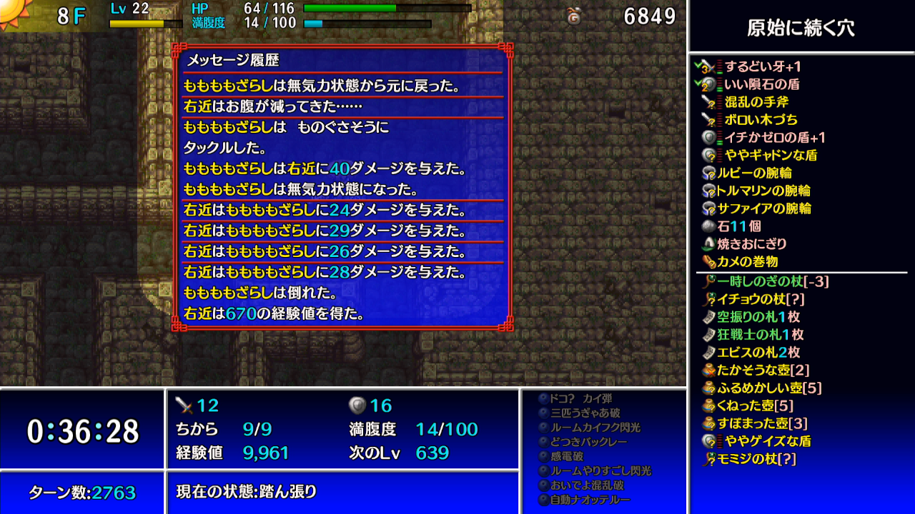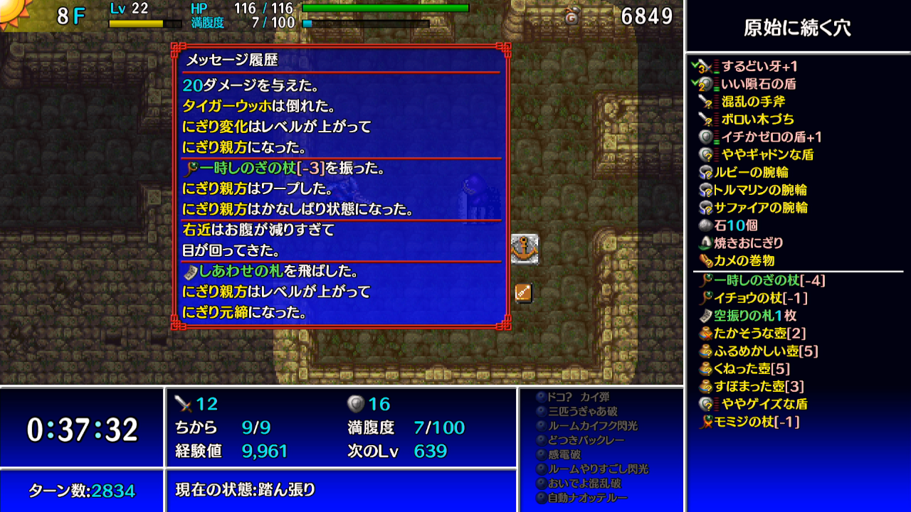 →ギタンマムルに痛み分けの杖を振って、他の敵等からシレンがダメージを受けて倒す。